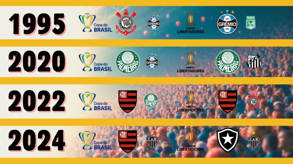 Em 2020, Palmeiras se sagrou campeão das duas competições, Libertadores em cima do Santos e Copa do Brasil superando o Grêmio.